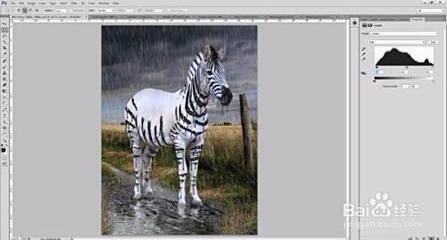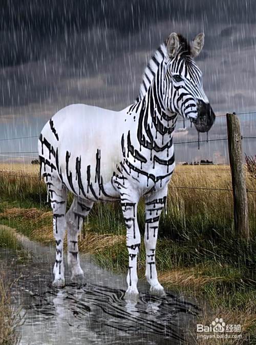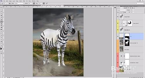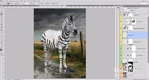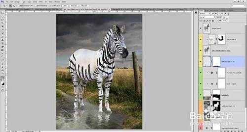插入水坑的图像,然后创建图层蒙版。拖移图层并将其置于斑马纹下方。转到图层>图层蒙版>全部显示。抓住软尖刷( B )。将笔刷不透明度设置为50 %,并在边缘周围绘制以将图像与背景混合。