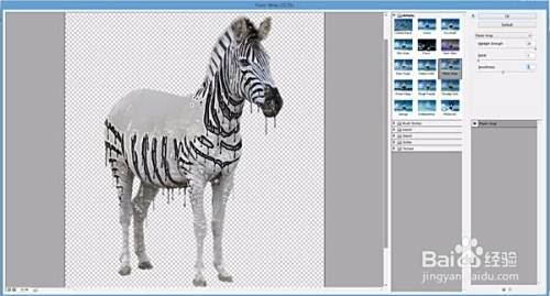 单击斑马纹液滴图层。抓住魔棒工具( W )。设置公差: 50,取消选中连续框并选择黑色条纹。按下Cmd / Ctrl + J并将其命名为条纹。按下Cmd / Ctrl + T并调整透视。使用液化过滤器将条纹推开。将混合模式更改为覆盖。
