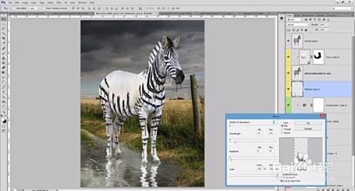 复制斑马液滴图层( Cmd / Ctrl + J ),将其命名为反射。转到“编辑”>“变换”>“垂直翻转”。放置并调整斑马液滴层下。将图层的不透明度设置为80 %。转到“滤镜”>“扭曲”>“波形”。选择“类型”:正弦,将发电机数量设置为5,然后单击“确定”。