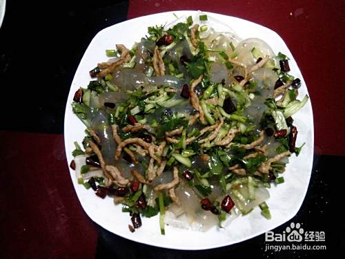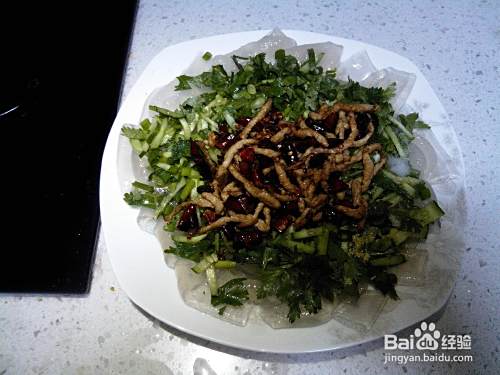 将锅里的肉丝辣椒花椒油趁热洒在蔬菜上边。