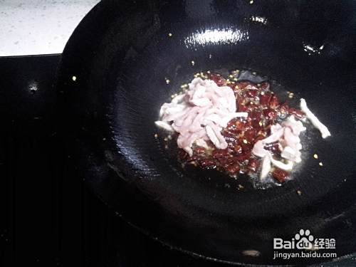 倒入底油,不要烧太热,放入肉丝和辣椒和花椒。