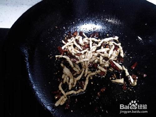 将肉丝和辣椒,花椒,炒熟,辣椒炒到酥脆的程度就好,不要胡了。