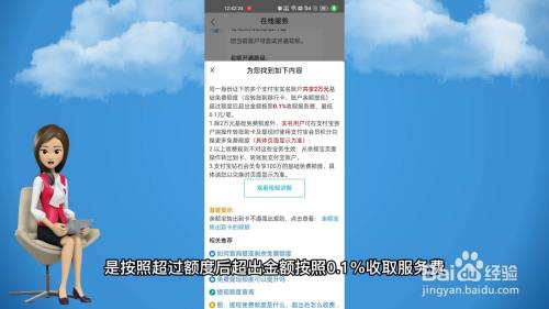 支付宝余额提现手续费按照超过额度后超出金额按照0.1%收取服务费来计算的,具体操作如下: