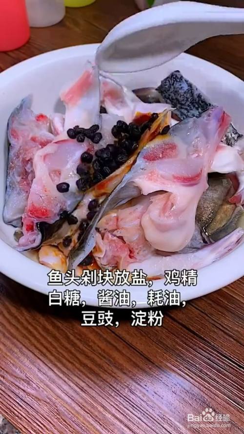 首先把鱼头剁块之后放入碗里,然后加入盐,鸡精,白糖,酱油,蚝油,豆豉,淀粉。