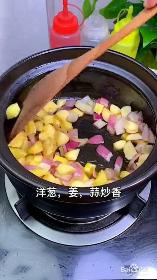 往锅里放入洋葱、姜、蒜,然后炒香。