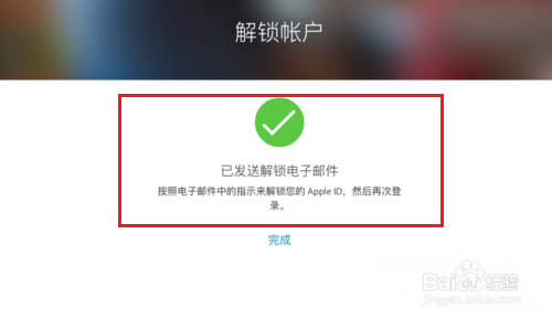 系统显示已经发送一封用于解锁 Apple ID 账户的邮件到注册Apple ID的邮箱中;