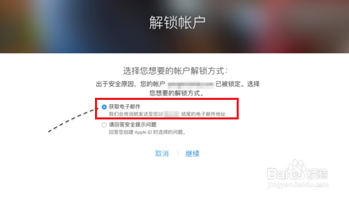 之后系统会有两种账户解锁方式可供选择,第一种为通过获取电子邮件,第二种则为回答安全提示问题。这里以“获取电子邮件”的方式为例,选中并“继续”;