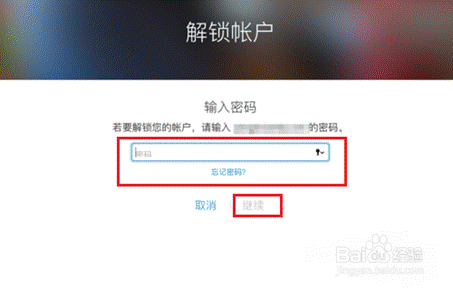 接着在“解锁账户”界面输入Apple ID和密码,点击“继续”;