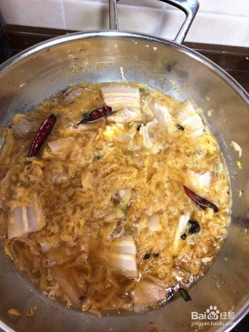 锅烧热,倒油,葱姜调料下锅爆炒。做这个菜,油要适当多放些哦,老人常说酸菜很吃油的。