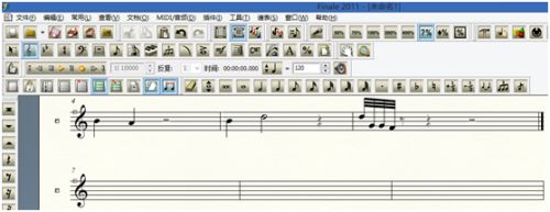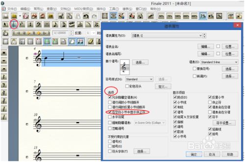 选择Finale 2011工具栏中的谱表工具,选中一个谱表双击鼠标左键后弹出谱表属性窗口,将选项在空白小节中显示休止符前面的勾取消,点击确定。