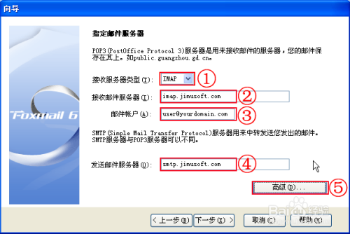 3 择接收服务器类型为“IMAP”,输入接收邮件服务器、邮件账户名、发送邮件服务器地址 ,然后点击“高级”;