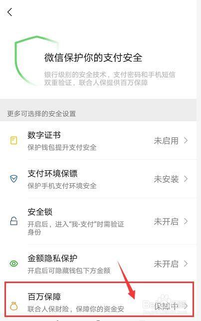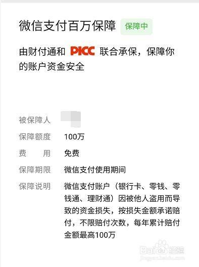 可以看到正在保障中。百万保障无法修改,也无法关闭,微信支付使用期间免费保障。