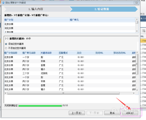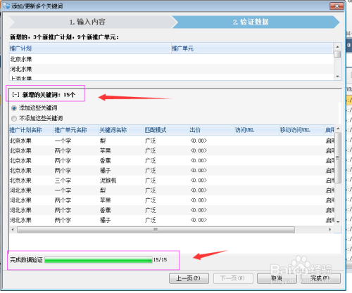 注意看,新增关键词数量,是否为你表格的数量,完成数据验证是否正确,如果有错误,返回修改。