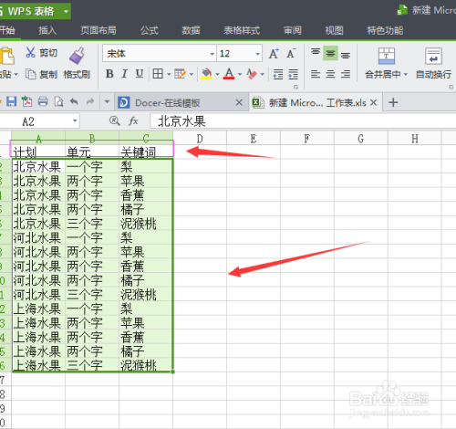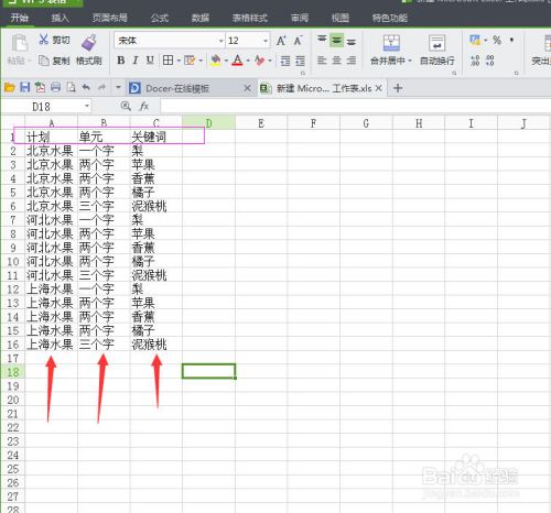 首先把分要的关键词(指分好计划-单元),放到表格里面。计划一列,对应计划的单元一列,关键词跟到最后面。举例子以水果为例子。分三个计划,北京水果,上海水果,河北水果,三类进行示例。计划后面跟着单元,然后后面是关键词,以这样的格式进行罗列。