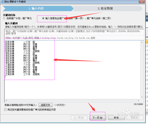 然后回到百度助手里面,选择第二项,输入信息包含推广计划名称,这一项,把复制的内容,粘贴到下面空白部分,然后点击下一步就可以了
