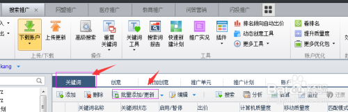 打开搜索推广之后,选择关键词层级,点击批量添加/更新