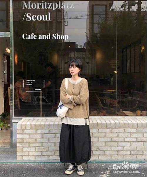 这套也很好看,并且很特别,在人群中很亮眼。宽松毛衣里面有一件白色T恤内搭,领口和下面封边处都露出来显得很有层次感。黑色的超宽松灯笼裙很特别,适合矮个子女生。经典黑色帆布鞋也是百搭款,不管是穿裙子还是穿休闲类的衣裤,帆布鞋都是首选。