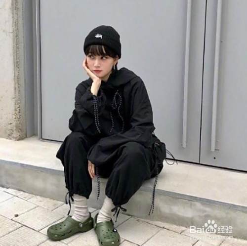 这一套黑色系简直太炫酷了!黑色上衣加黑色裤子,鞋子很特别,军绿色洞洞鞋是很多人夏天必备款。这件黑色上衣袖口和领口处都有抽绳设计,风格百变但却也和百搭。黑色裤子也是一样,口袋处和裤口处都有抽绳,只是抽绳设计与上身的不一样,是纯黑色抽绳,而上衣的抽绳是黑白混合色。