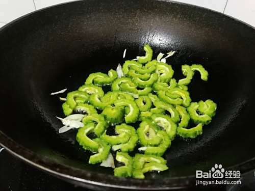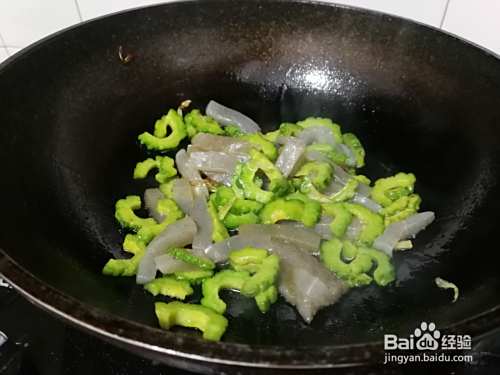 放入苦瓜煸炒1分钟左右,放入魔芋豆腐煸炒,放入盐,生抽煸炒。