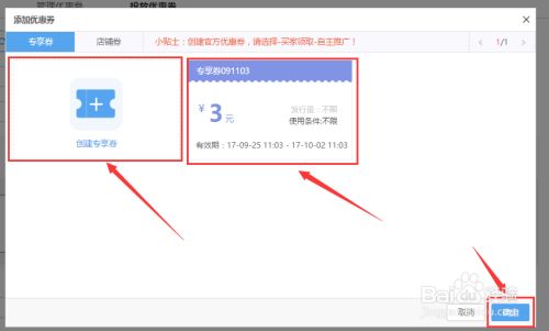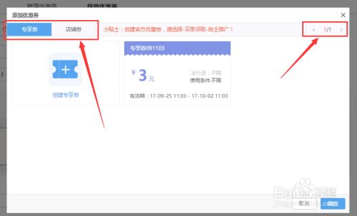 点击【选择优惠券】按钮,进入【添加优惠券】窗口,选择要在页面投放的优惠券。首先选择优惠券的类型,分别为【专享券】和【店铺券】。如果没有设置好优惠券可以在添加优惠券窗口点击【创建专享券】按钮,进行优惠券创建;创建好优惠券后,鼠标点击勾选需要投放的优惠券,选好后点击窗口右下角【确定】按钮。