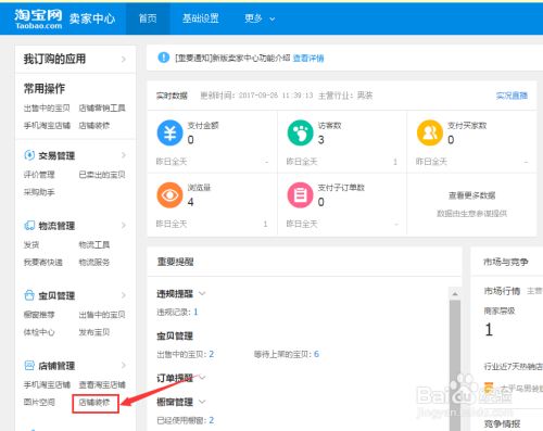回到卖家中心页面,在左侧导航栏,找到【店铺管理】里面的【店铺装修】选项,点击进入店铺装修页面。
