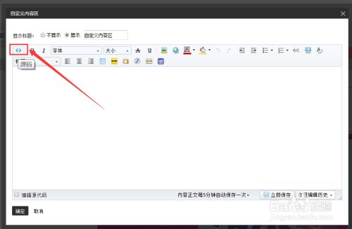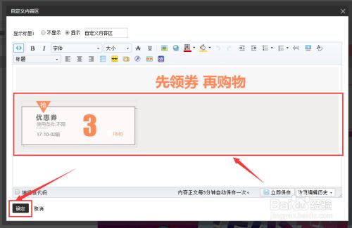 在编辑页面左上角点击【源代码】按钮,将装修页面换成代码模式;将在第六步中复制的代码,粘贴在输入框内。依然点击【源代码】按钮,将页面转换回图文模式,查看优惠券效果,确认无误后,点击页面右下角【确定】按钮即可。
