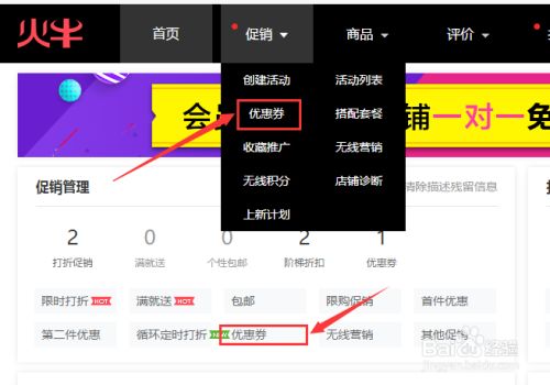 在火牛首页导航栏找到【促销】中的【优惠券】,点击进入优惠券设置页面;或者在火牛首页找找【促销管理】栏中的【优惠券】点击进入优惠券设置页面。
