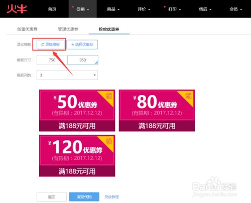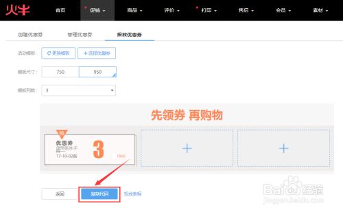 选择模板的尺寸,一般在首页投放使用950的模板,详情页选择750的模板;选择模板列数,既在该优惠券模板中显示的优惠券种类及金额。在投放优惠券页面预览制作的优惠券投放后的效果,确认后点击【复制代码】按钮。