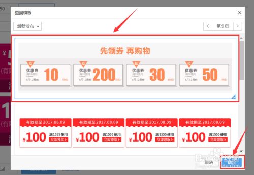 在投放设置页面首先选择模板,点击【更换模板】按钮,打开【更换模板】窗口后,通过窗口上面的分类和页面选项,选择合适自己店铺的优惠券模板,勾选模板后,点击页面右下角的【确定按钮】。