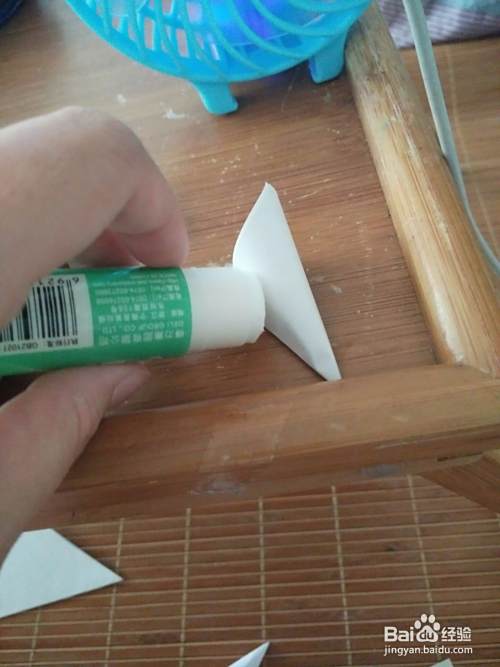 一边涂上胶水,把2个三角形粘合起来做成一朵花瓣。如图所示。