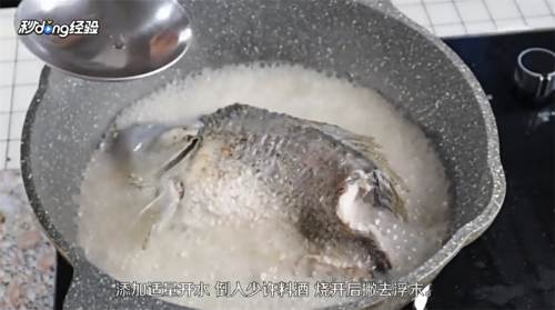 3添加适量开水,倒入少许料酒,烧开后撇去浮沫。