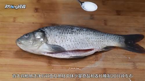 1首先将鲫鱼洗净后双面及鱼肚中抹少量食盐和姜片腌制二十分钟左右。