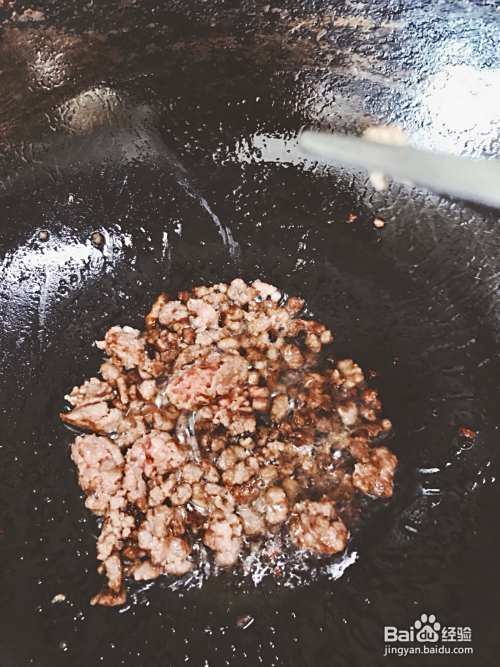 热锅凉油,少量少量的油,等几秒就可以放肉馅了,翻炒。