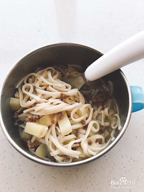 准备好原料,葱切碎丁,土豆切丁。建议家里有宝宝的经常冻一些肉馅,平时可以做馄炖、肉丸、也可以这样简单一炒煮面条,非常方便。