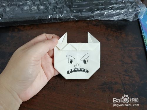 把中间的角向上折再向下折,如图一。然后,在纸上画上凶神恶煞的样子就可以了。