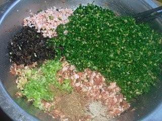 2,荠菜洗净剁碎,加入一点剁碎的白菜,因为荠菜本身有一种野菜的味道,全用荠菜包饺子味道不如加入一点白菜好吃。海米泡水切碎,混合在馅里搅拌均匀即可。