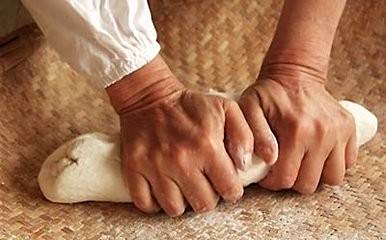 包饺子:面团搓成长条,切成剂子,擀皮,包馅,捏成型。