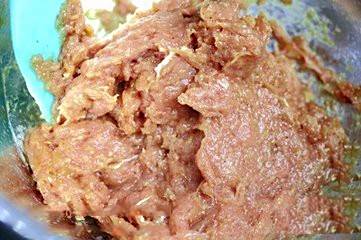 馅料做法:1,肉馅里打入两勺水,加入一大勺花生油,一勺香油,加入生抽,盐,味精,大酱等调料顺一个方向搅至上劲。