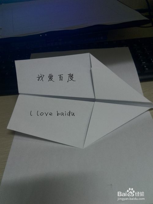 到此为止,整个折的过程全部结束。成果如图所示。也可以在机翼上面写上你喜欢的话语。我在机翼上面写上“我爱百度”和“I love baidu”。大家看图片吧。看明白了没有呢,记得动动小手哟!