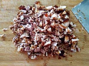在醒面的过程中,来准备饼的馅料:海带提前煮熟剁碎,卤蹄膀肉连着皮冻一起剁碎。