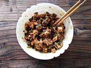 先做烫面。把面粉及盐放盆中,把沸水冲入,用筷子搅拌成絮状。稍凉一些再慢慢加入冷水和植物油。