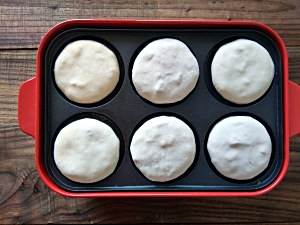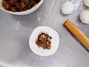 饧好的面团取出再次揉匀,分切成6等分,将小面团压扁擀成中间厚边缘薄的圆面片,包入馅料。