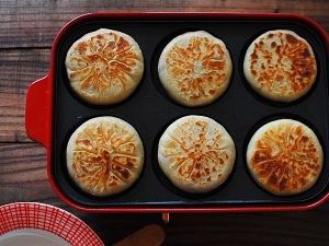 煎锅内放少许油,再放入馅饼,用中小火慢慢煎至两面金黄上色即可。现煎现吃,搭配番茄浓汤、烫青菜,就是营养又美味的一餐。
