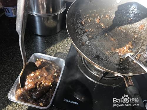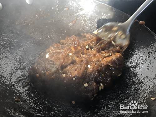 倒入搅拌好的地瓜红甜品,大火不停的翻炒十来下,转小火炒至如图的状态。加入炒熟花生碎继续炒,炒的过程中觉得干了就加猪油继续炒。(猪油多了炒出来的年糕很香)