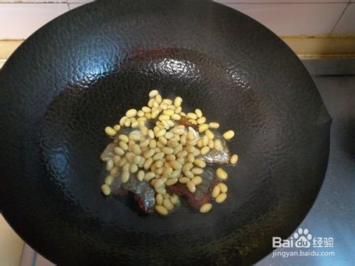将大蒜放入锅中爆出香味,将黄豆放入锅中