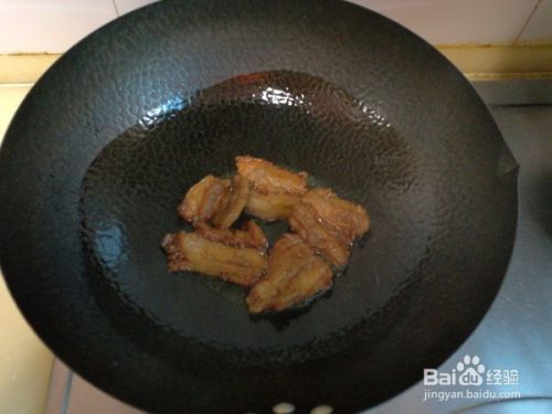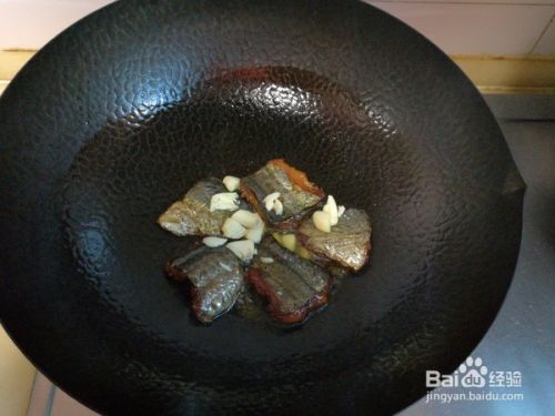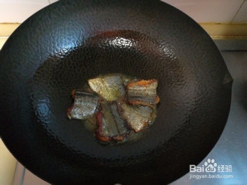 炒锅中放入适量调和油,油热后将鲅鱼干放入锅中煎一会,煎一会后翻面煎另一面