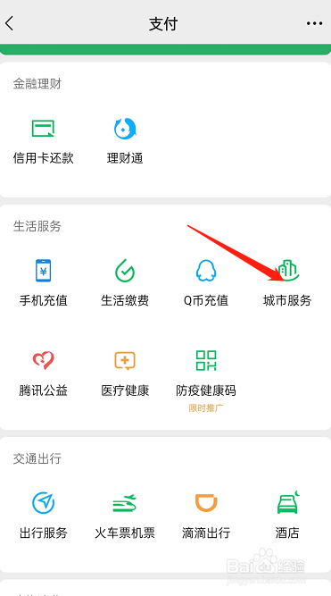 打开手机微信,进入【我的】界面,点击手机【钱包】选择【城市服务】选项。