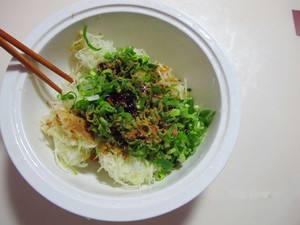 炒勺放油将虾仁碎,姜,一点点葱炒香。炒好的虾仁和剩余的葱叶一起放入萝卜丝中,加蚝油、花椒粉、生抽、盐、糖搅拌均匀。