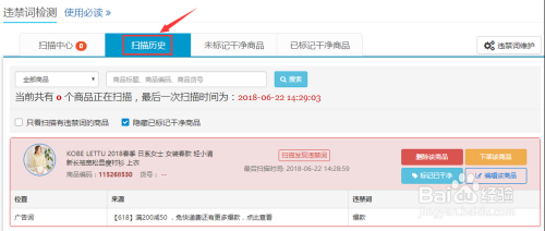 点击扫描历史,即可查看检查结果,出现违禁词的商品,点击删除或者点击编辑该商品,进行违禁词删除,这样商品违禁词就检测完成了