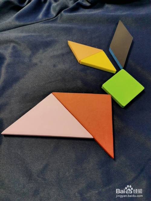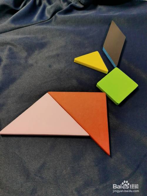 拿出一个黄色小号三角形板放在黑色平行四边形板的左边,如图所示。